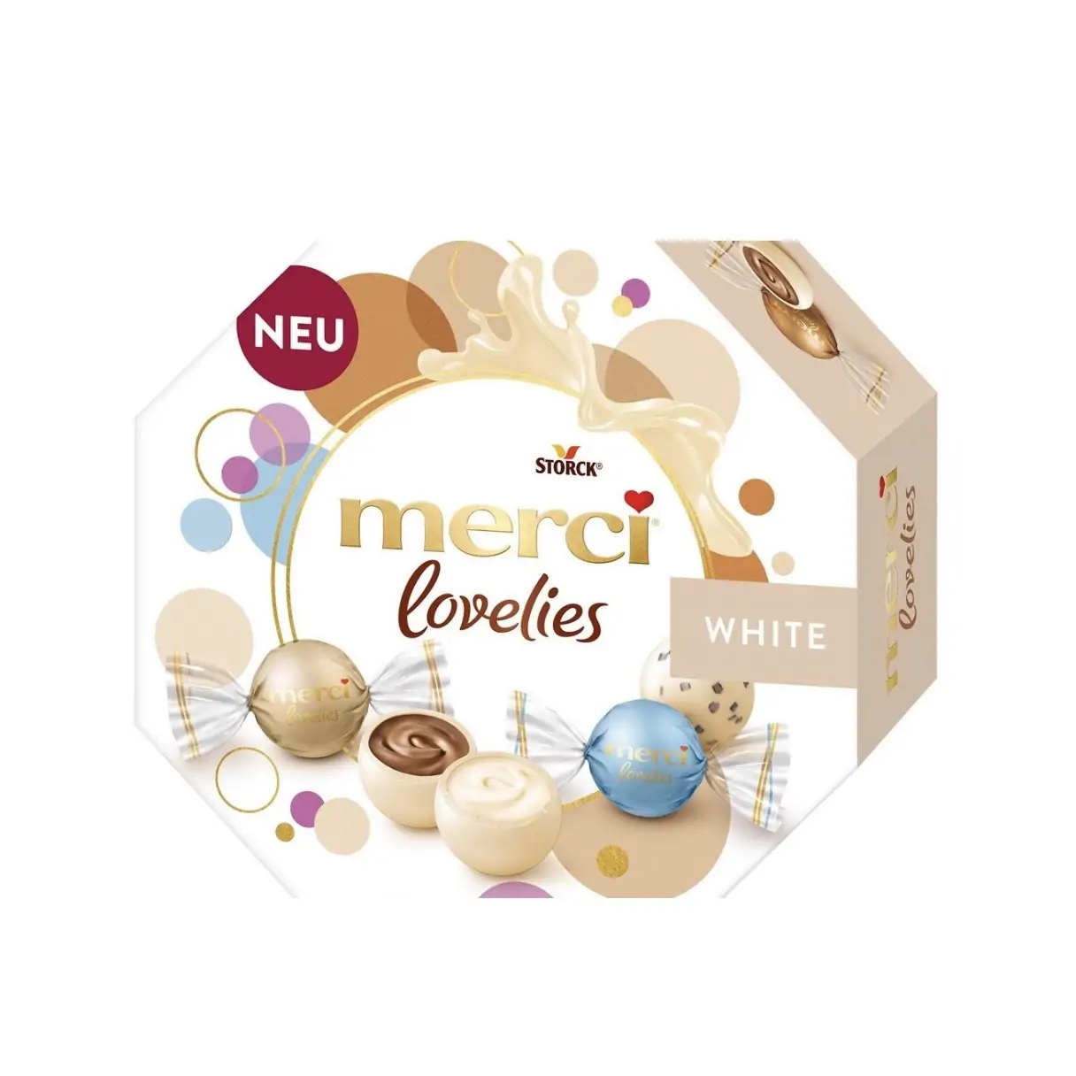 Добавете кутия Бонбони МЕРСИ ЛАВЛИС БЯЛ ШОКОЛАД 185 гр.. към букет цветя за да е пълна изненадата.