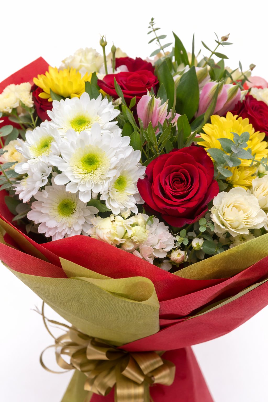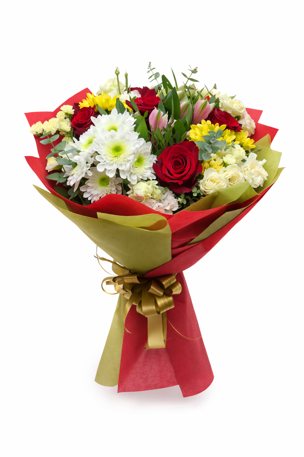 Наситено червените рози придават дълбочина и романтика, белите хризантеми носят чистота и хармония, а слънчево жълтите акценти добавят жизненост и топлина. Фината зеленина и златистата панделка завършват визията с усещане за класа и стил.