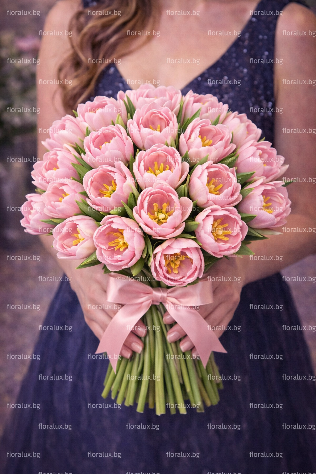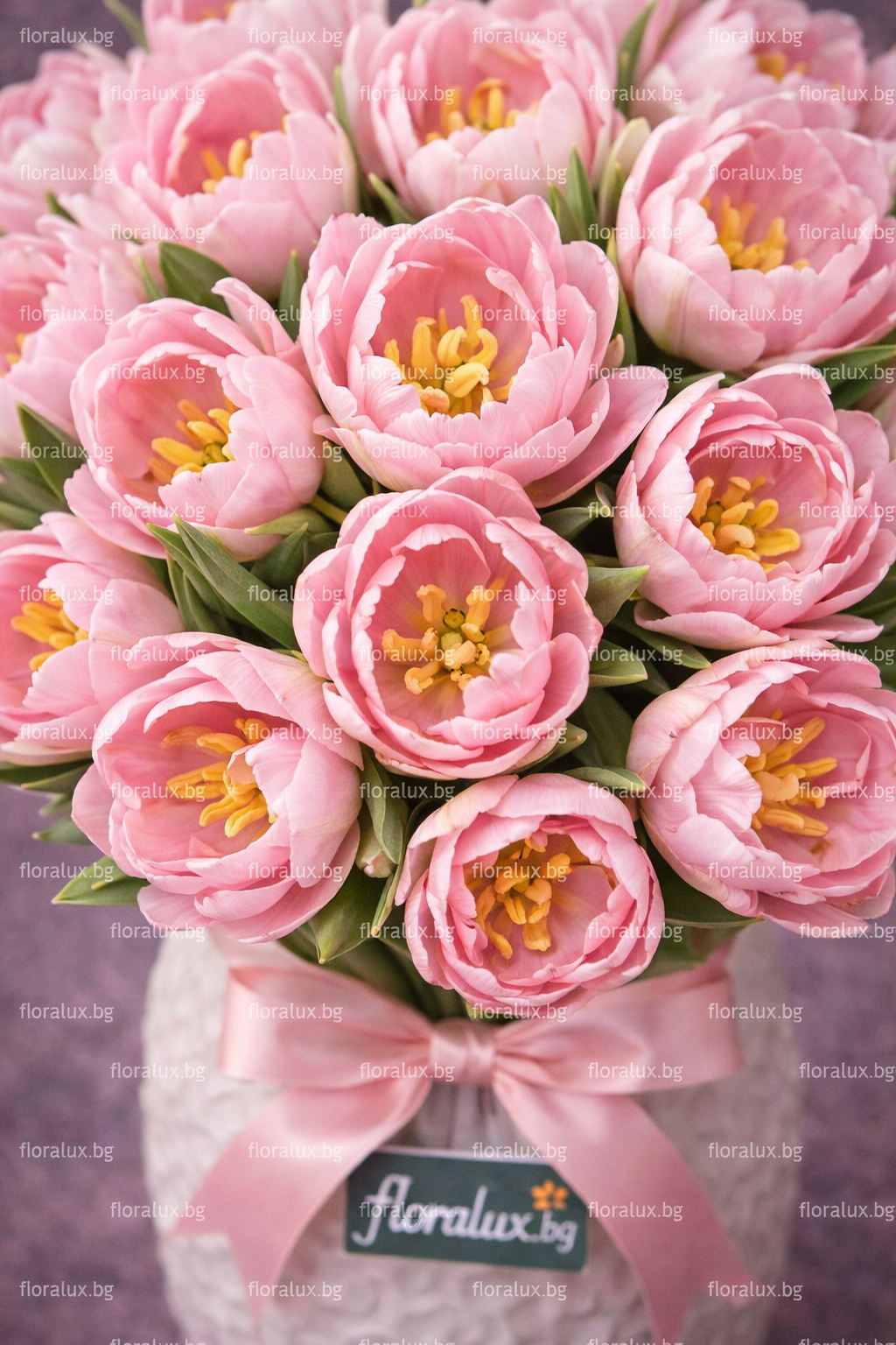 Този модел е изработен от божурести (двойни) светло розови лалета, отличаващи се с многослойни, богати венчелистчета и деликатен преход от меко розово към почти перлени краища. Формата е плътна и хармонична, а цветята са подредени така, че да създадат естествено движение и фин обем.