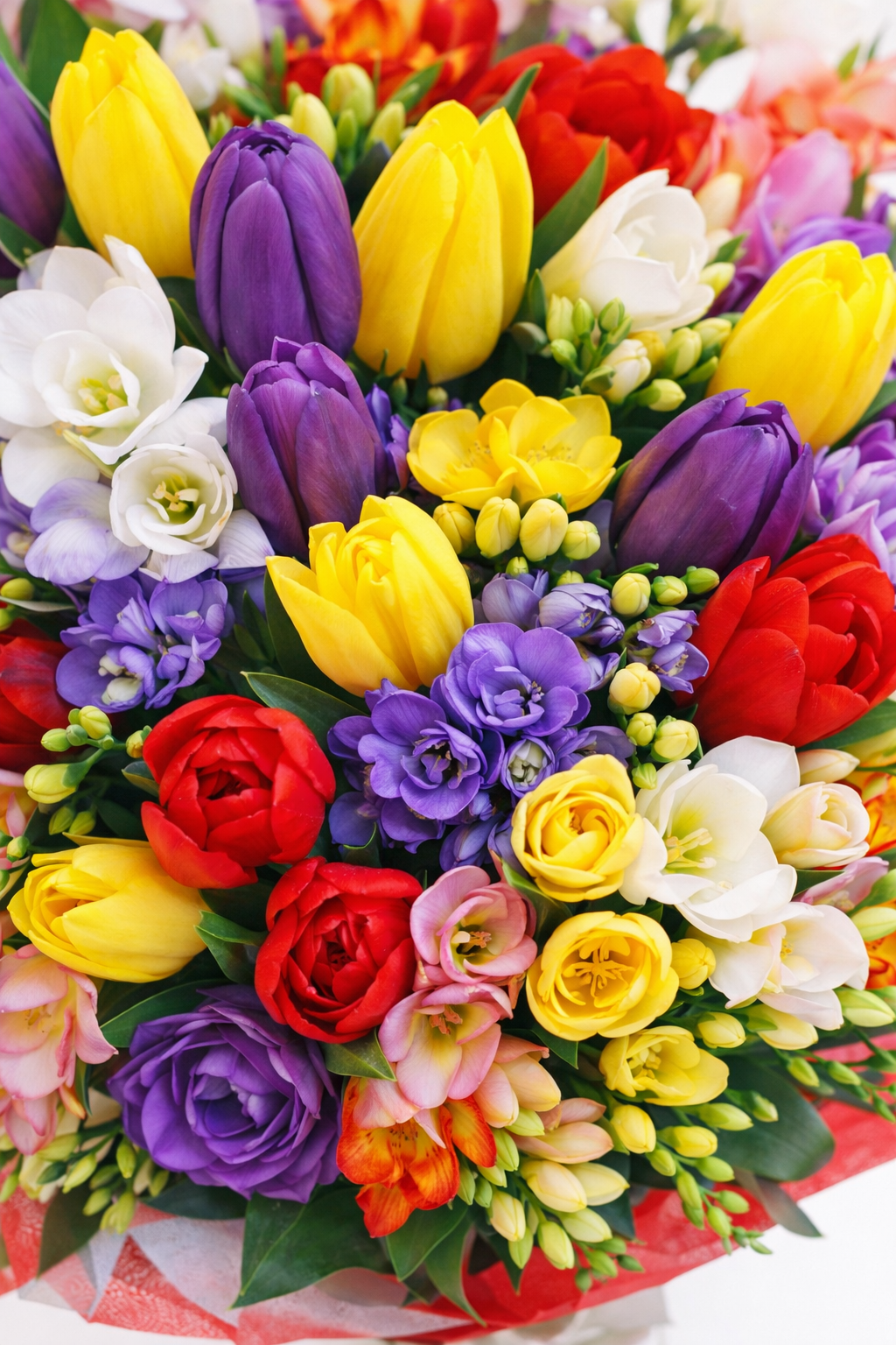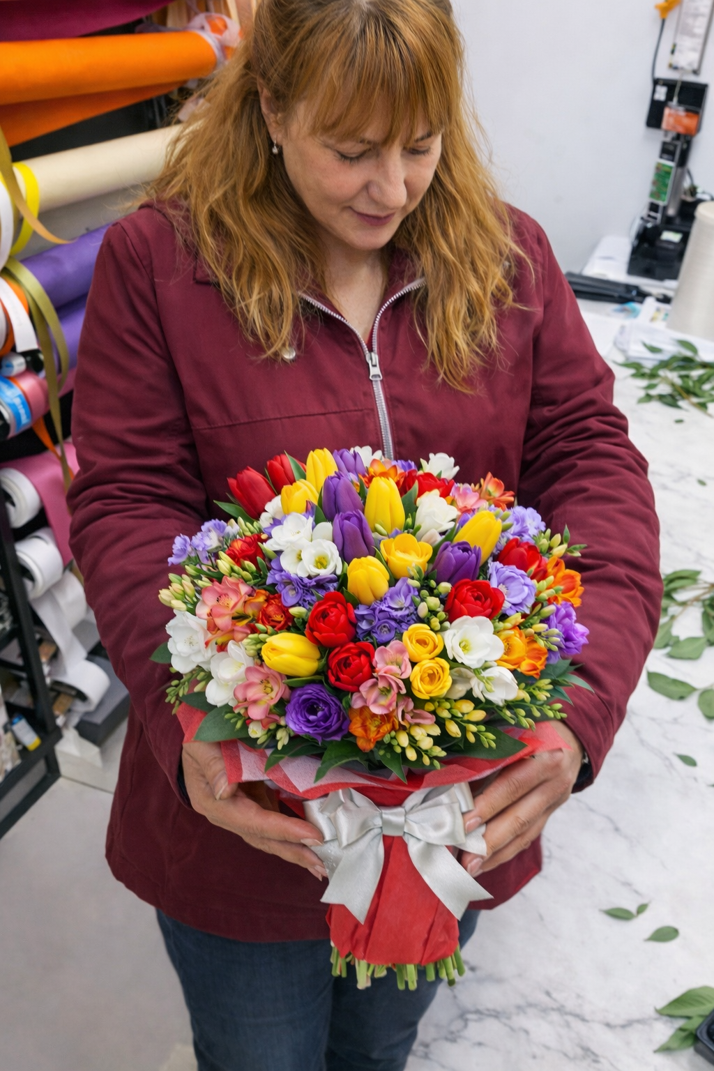Букетът впечатлява със своята богата цветова палитра – ярко жълти, червени и лилави лалета се съчетават хармонично с нежни фрезии и декоративни цветя, които придават обем, свежест и изисканост. Зеленината подчертава естествената красота на цветята и създава баланс между цветовете.