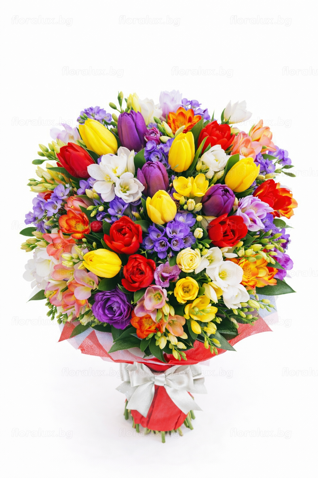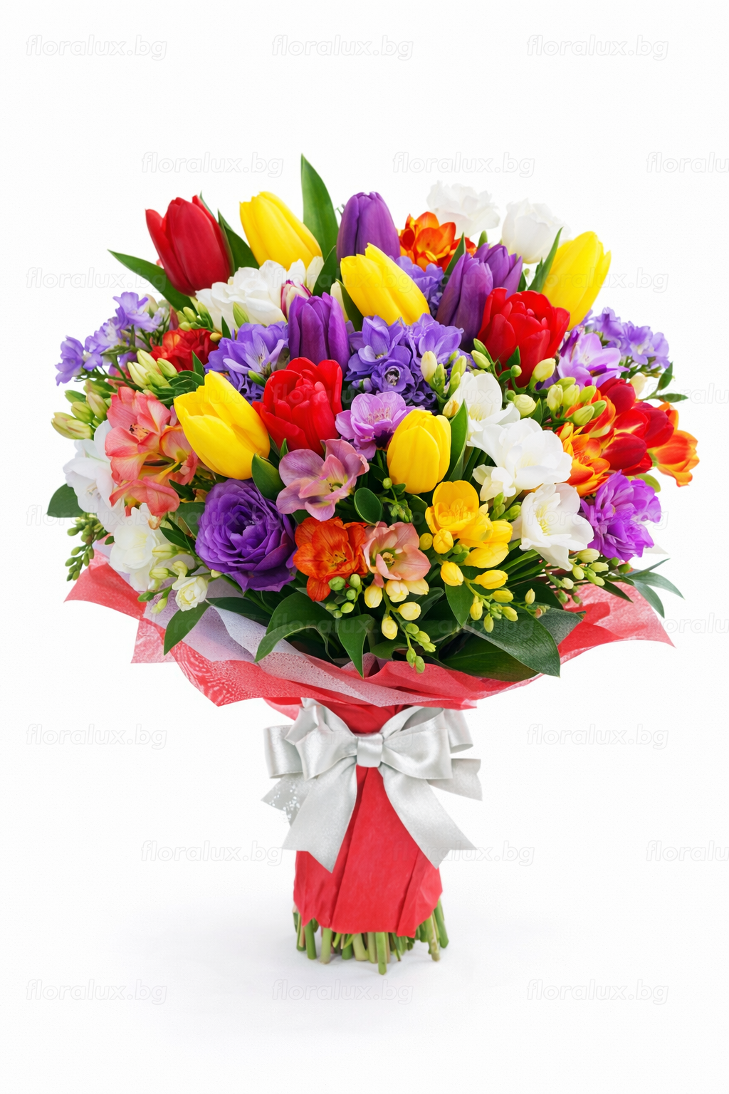 Този изключително красив и пъстър Букет "Пролет" е създаден, за да внесе настроение, свежест и емоция във всеки специален момент. Композицията съчетава едни от най-обичаните пролетни цветя – лалета, фрезии и нежни сезонни цветове, подредени с внимание към всеки детайл от флористите на Floralux.