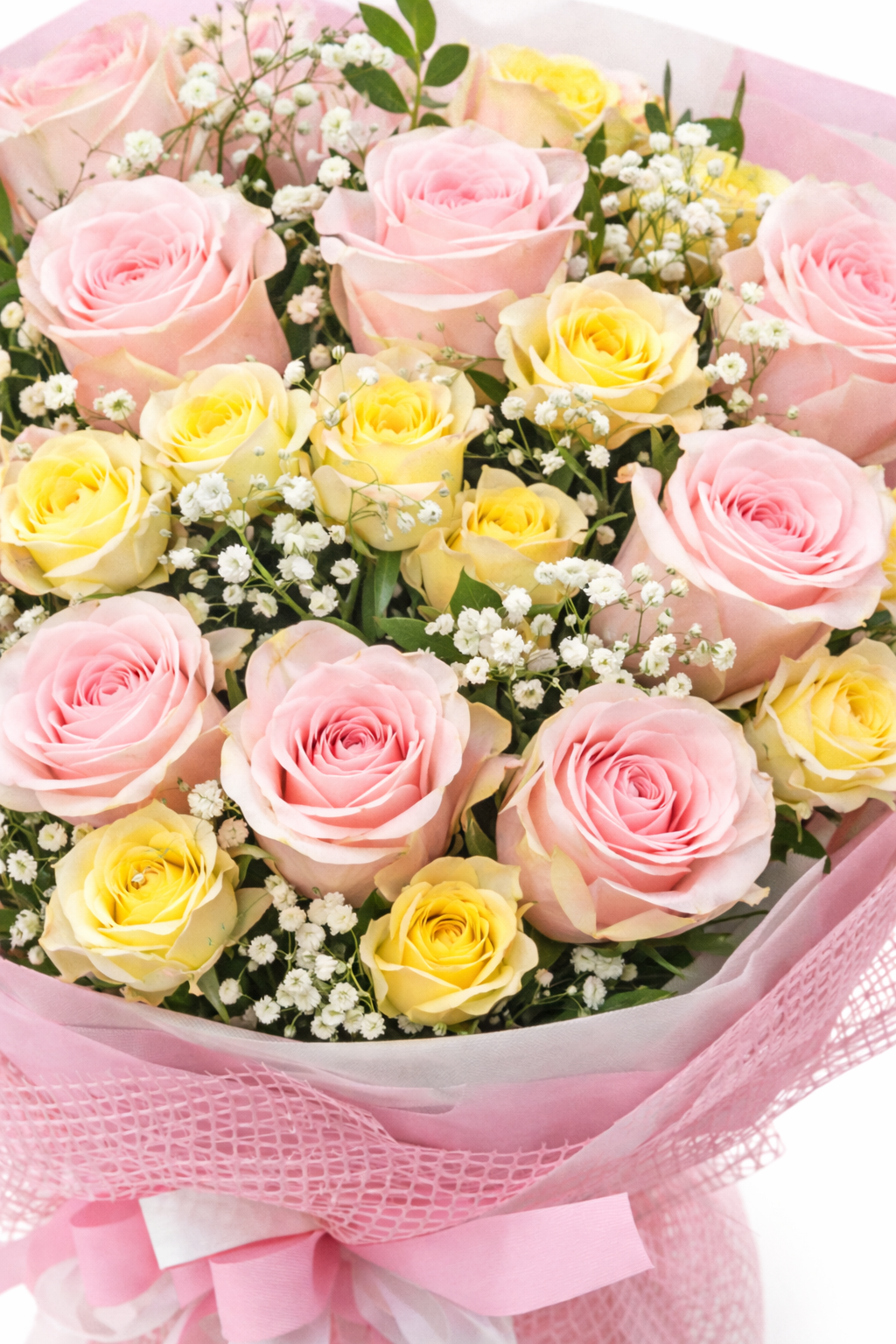 Свежест, мекота и светлина в едно съвършено съчетание от пудра розови и слънчево жълти рози. Този букет носи усещане за ново начало, радост и топлина – като първите слънчеви дни на пролетта.