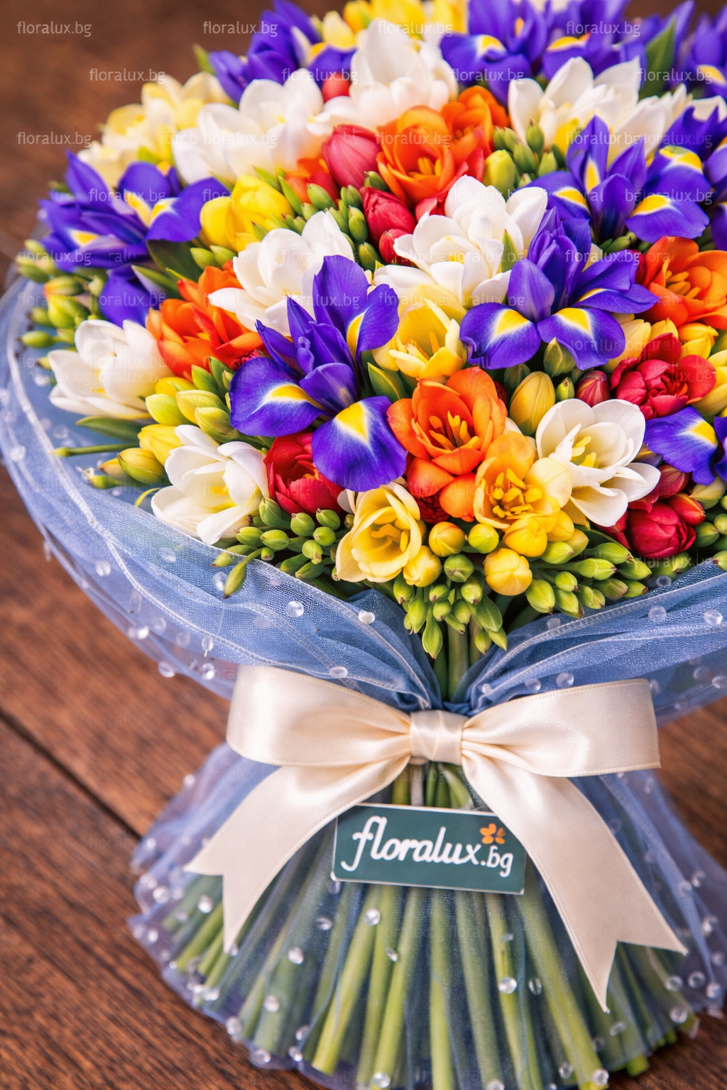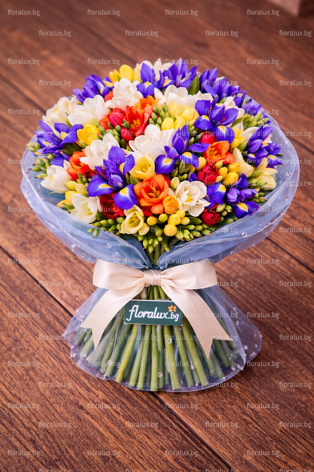 Композицията включва пъстри фрезии в бяло, жълто, оранжево и червено, които носят лекота и фин аромат. Между тях са вплетени сини ириси с характерен жълт акцент, оформящи нежна „сълза“ в структурата на букета – детайл, който придава артистичност и дълбочина.