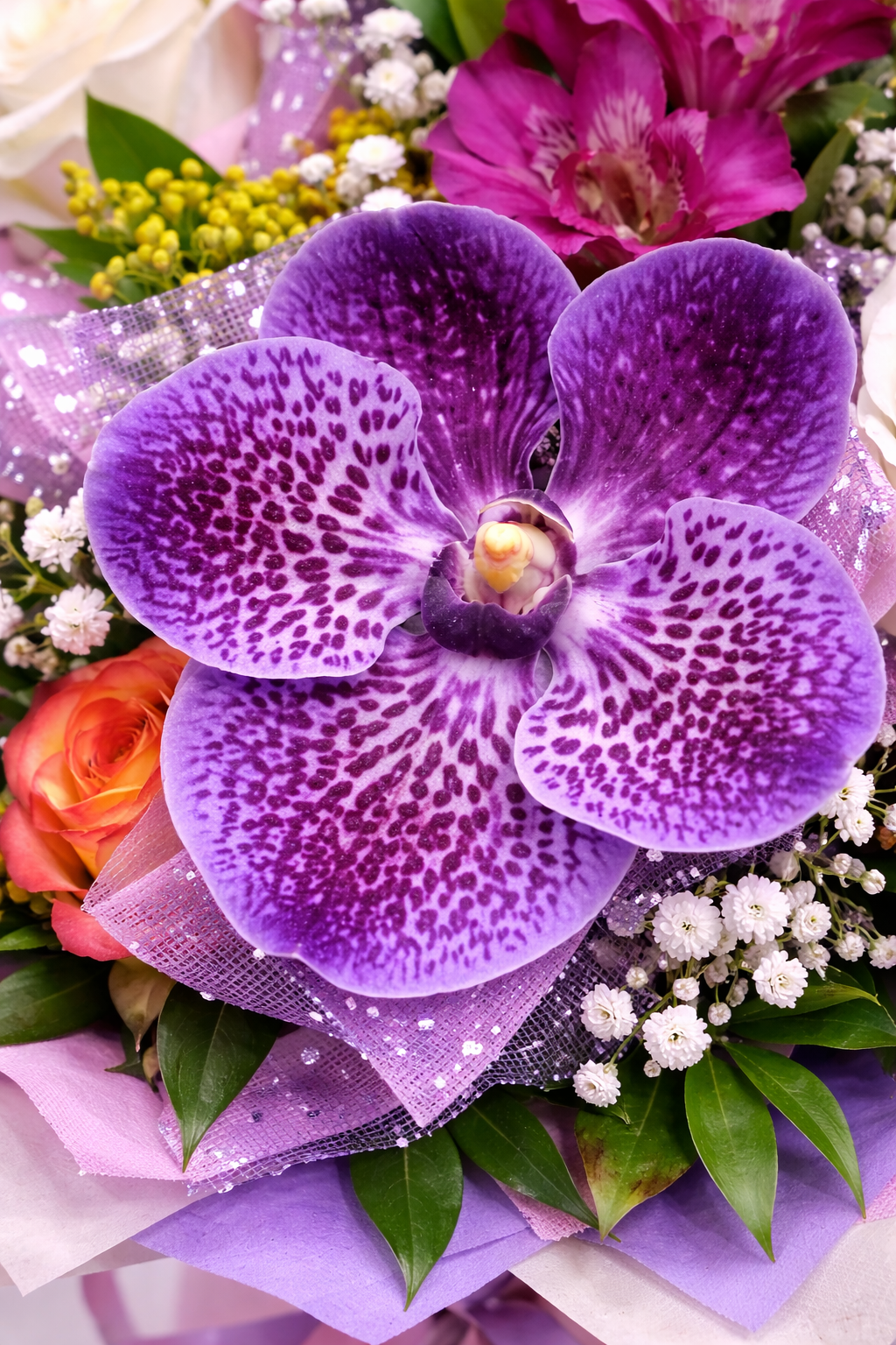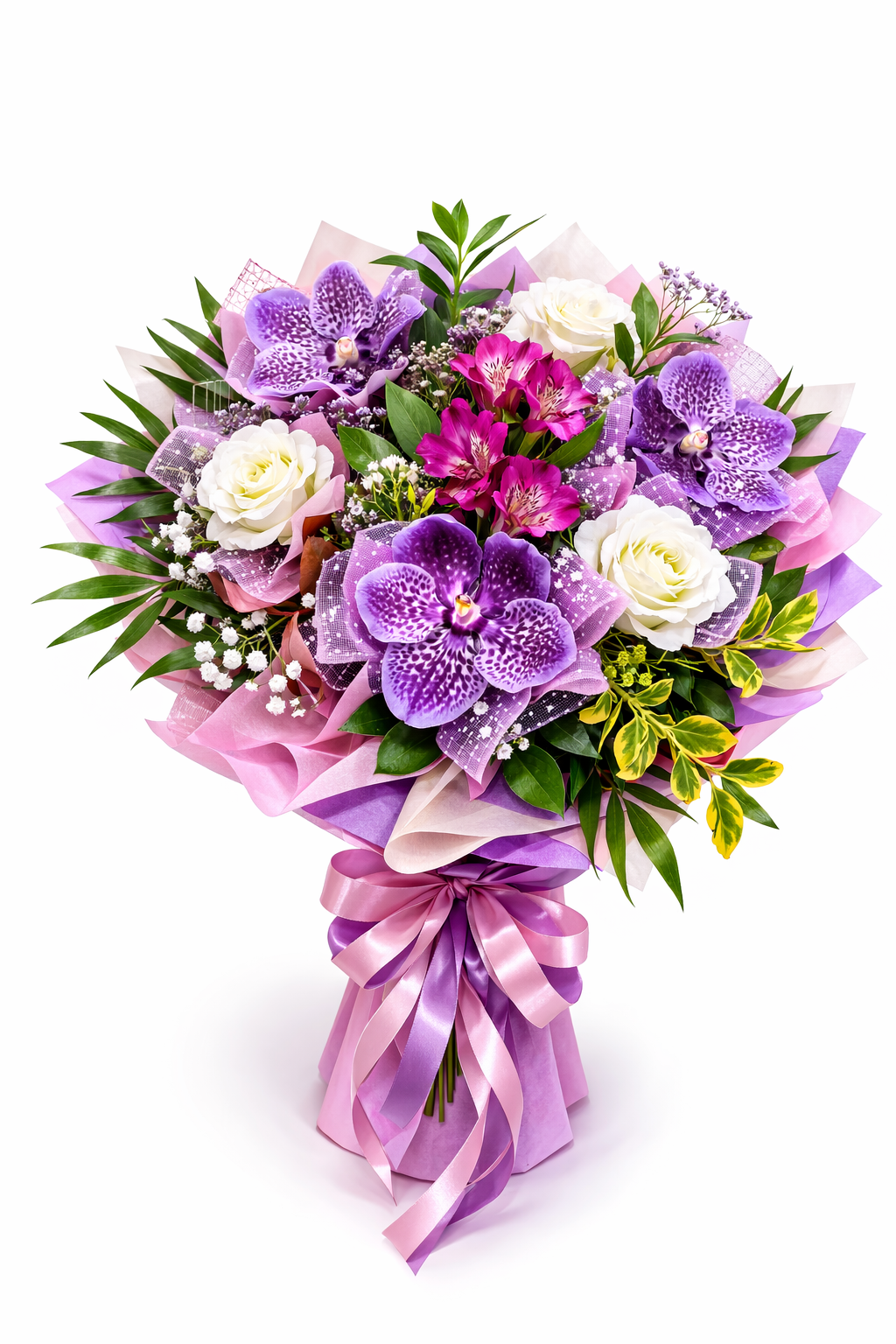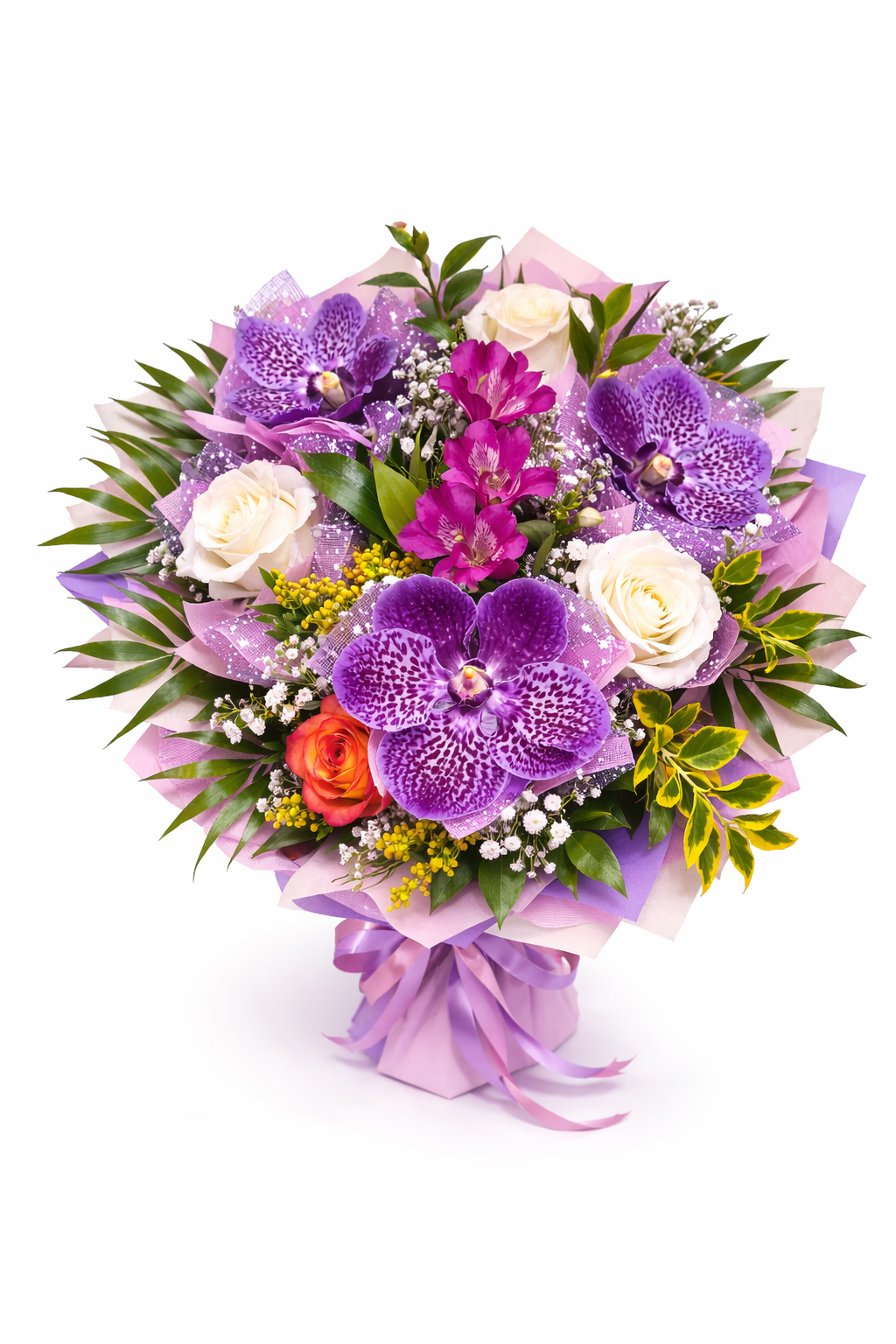 Изискано съчетание от екзотични орхидеи Ванда, снежнобели рози и нежни алстромерии, подредени в луксозна пастелна опаковка с фина сатенена панделка. Този букет излъчва класа, стил и романтика на високо ниво.