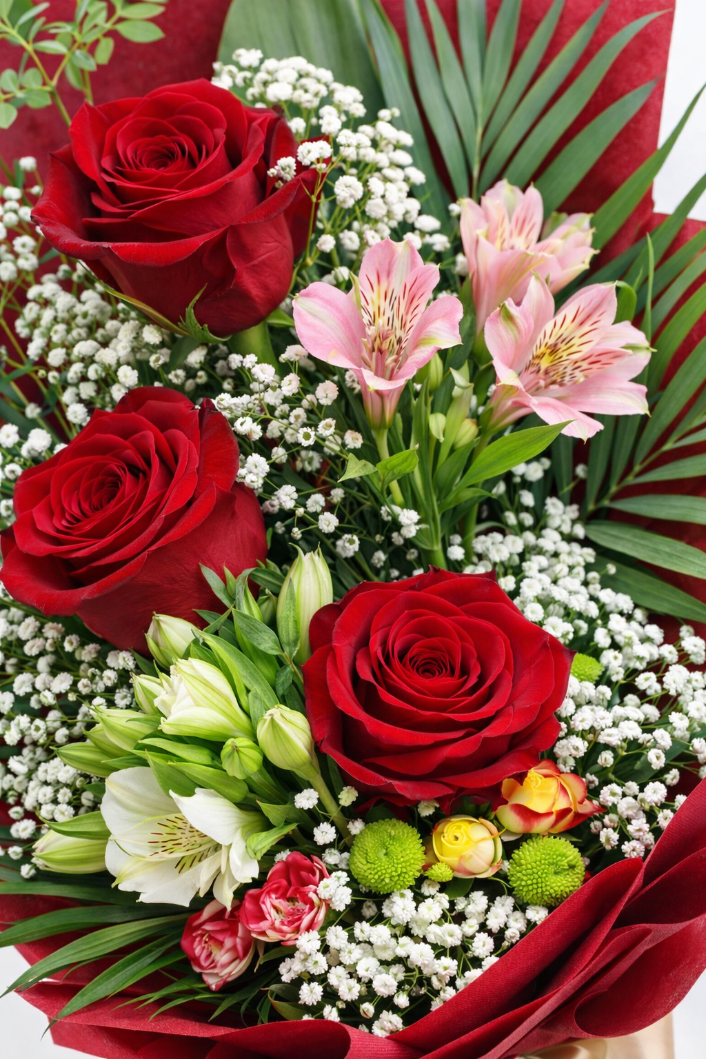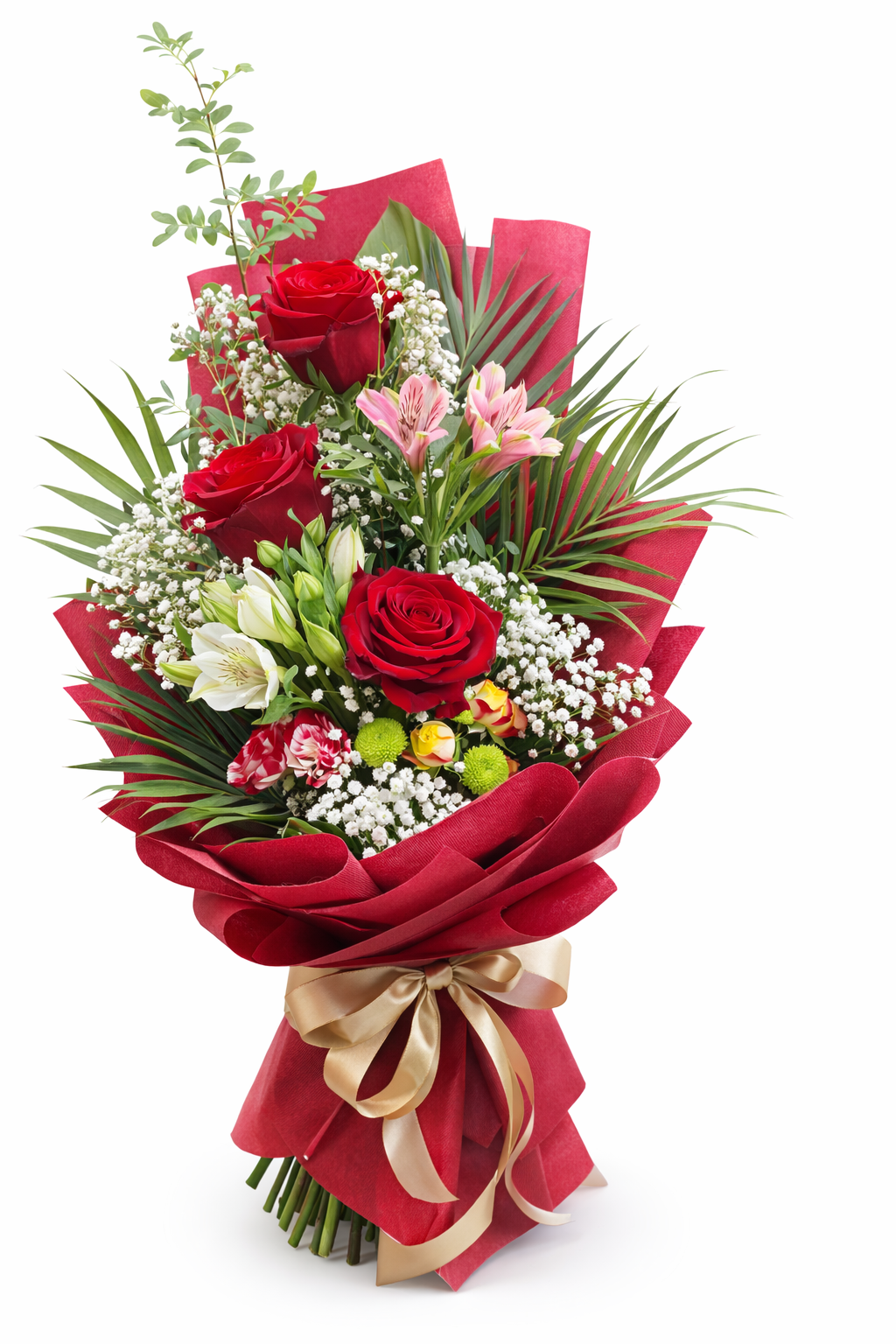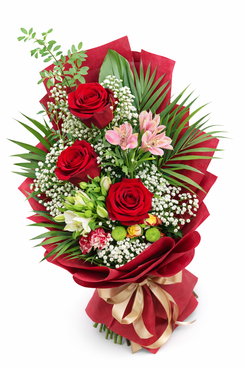 Три наситено червени рози заемат централно място в композицията – символ на любов, уважение и дълбока емоция. Те са обгърнати от нежна гипсофила, фина алстромерия и свежа зеленина, които придават обем и мекота. Червената опаковка и златната сатенена панделка завършват визията с усещане за лукс и стил.