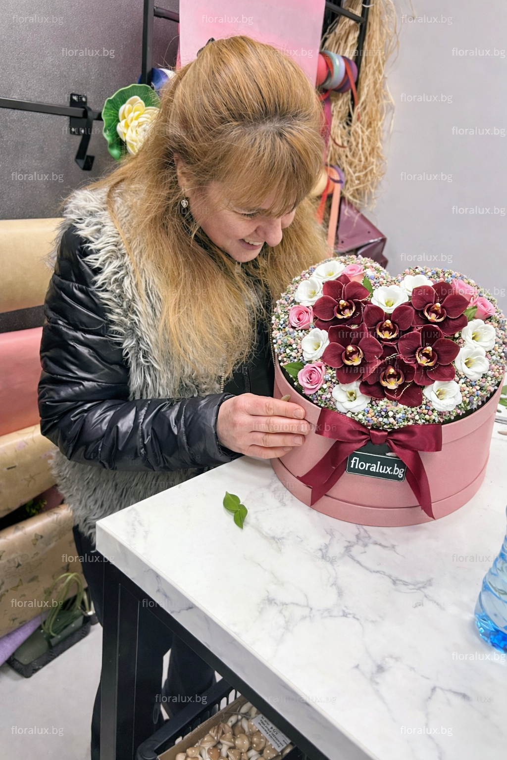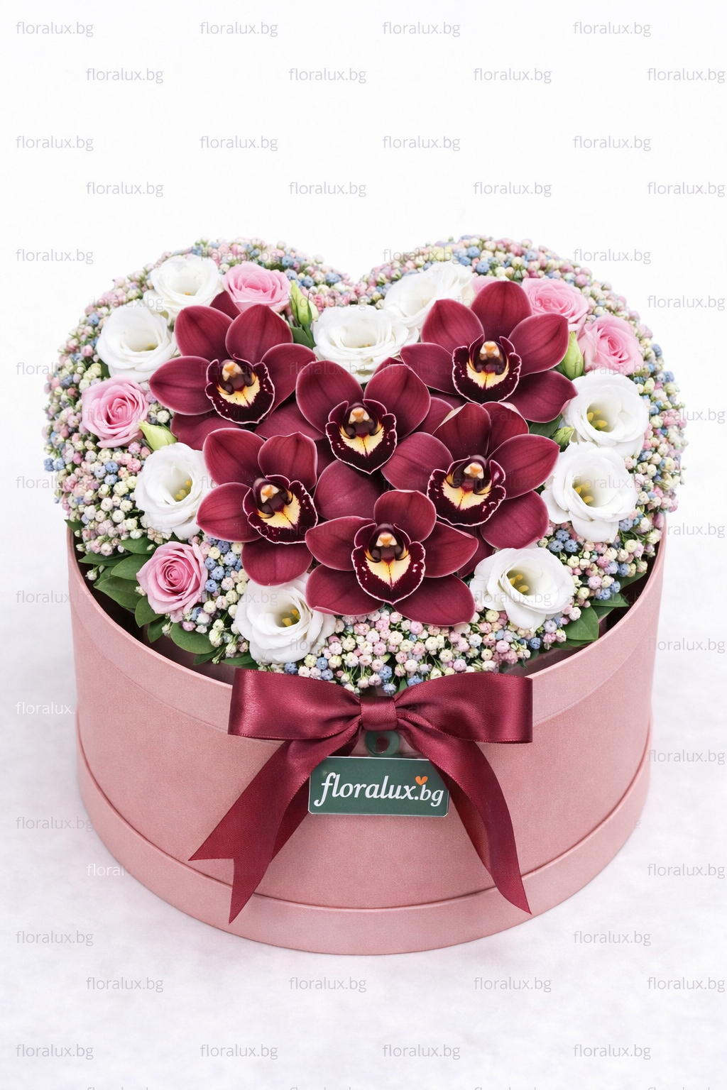 Цялата композиция е аранжирана в розова кръгла кутия, която подчертава луксозния характер на подаръка. Кутията е завършена с бордо сатенена панделка и стилна табелка с логото floralux.bg.