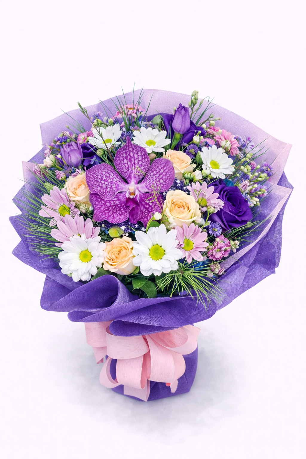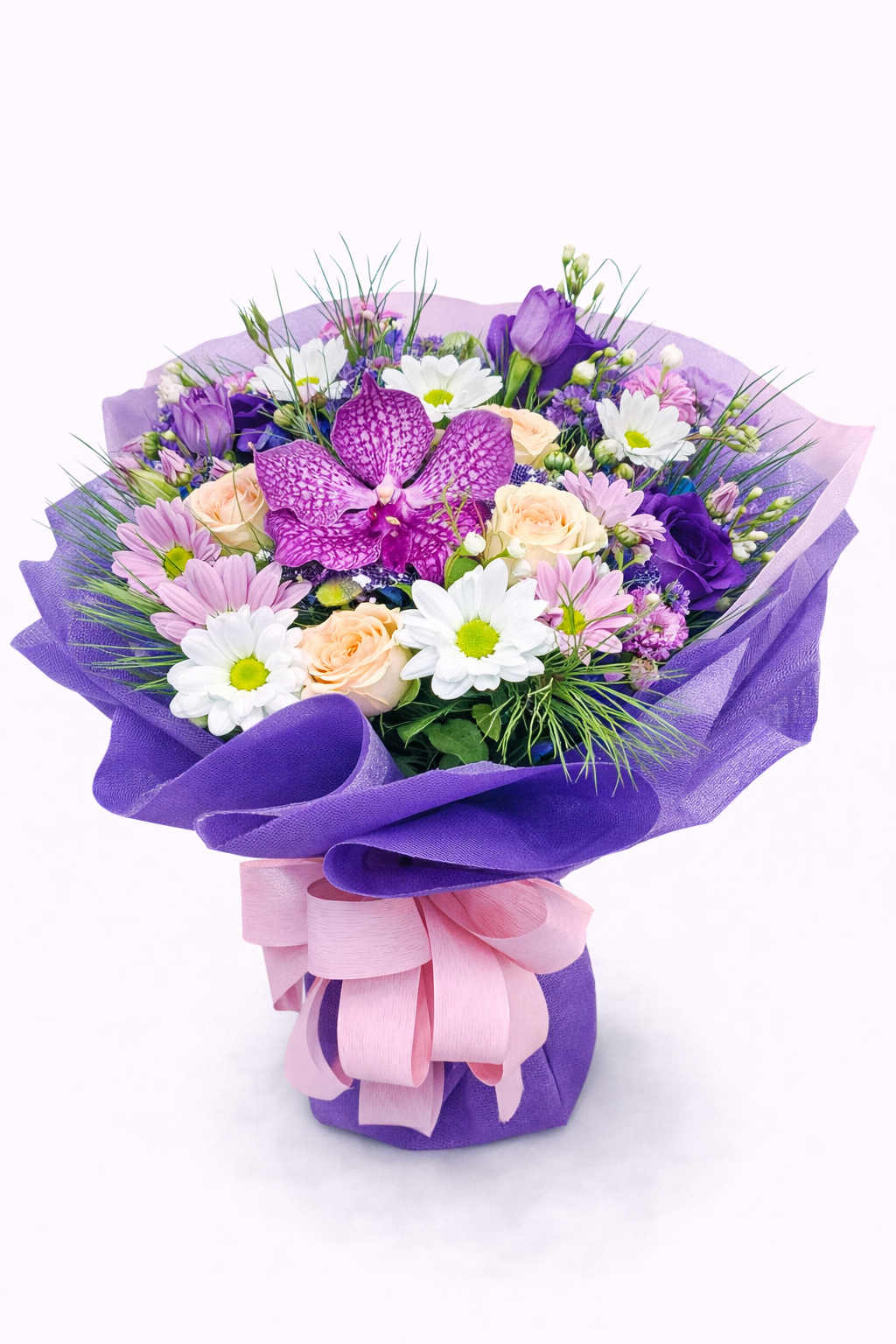 Нежен и изискан букет в лилаво-розова гама, съчетаващ орхидея, рози и свежи маргаритки. Елегантна композиция с фин аромат – перфектен избор за специален жест, рожден ден или израз на внимание и стил.