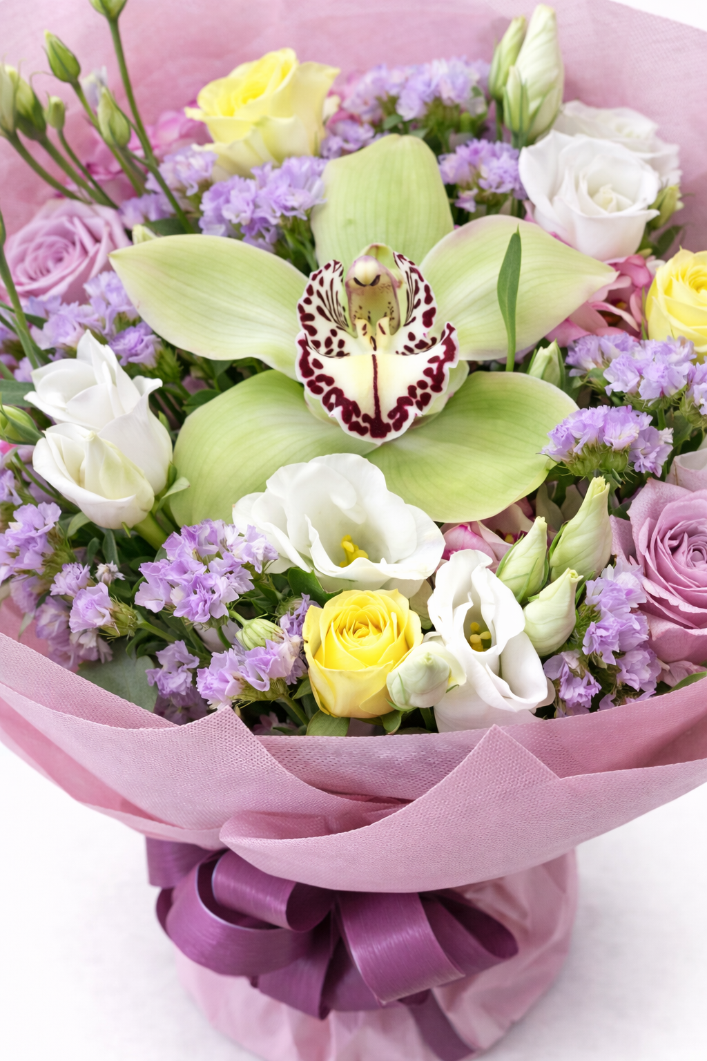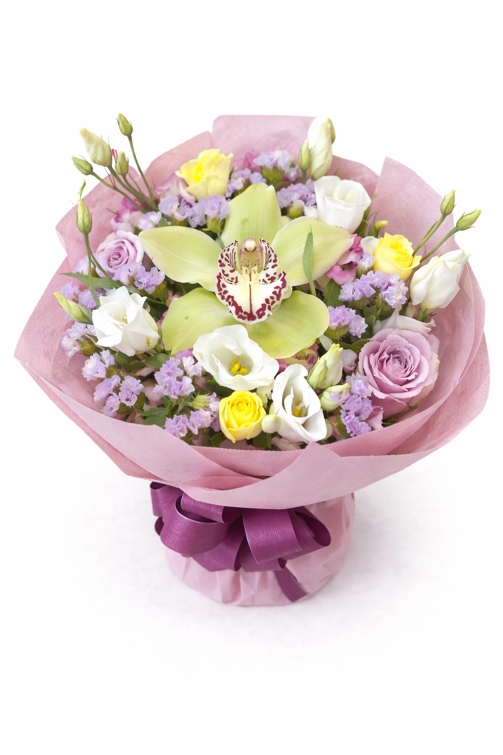 В центъра на букета е поставена красива орхидея цимбидиум, която придава луксозен акцент и привлича погледа със своята изящна форма. Около нея са подредени свежи рози в розови и кремави тонове, които символизират любов, внимание и искрени чувства.
