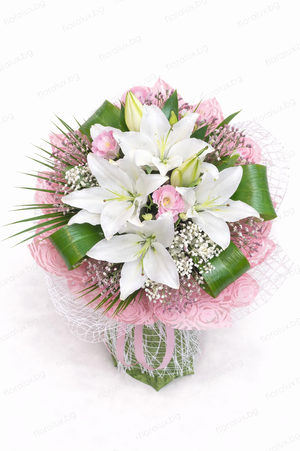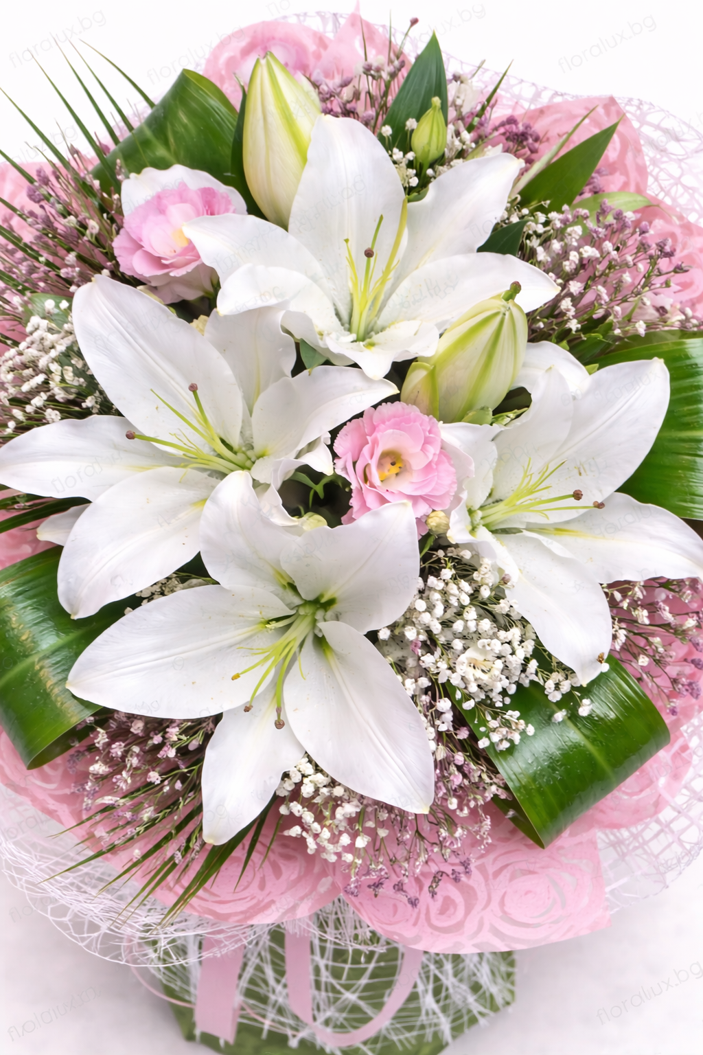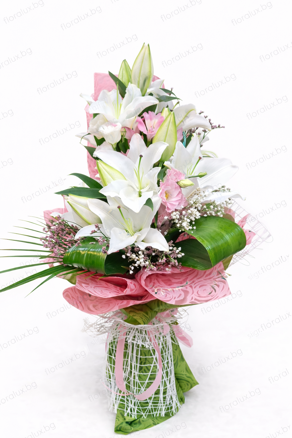 Белите лилиуми впечатляват с големите си разтворени цветове и фин аромат, а деликатните розови акценти и ефирният гипсофил придават романтика и мекота на композицията. Богатата зеленина добавя свежест и обем, създавайки балансирана и изключително елегантна визия.