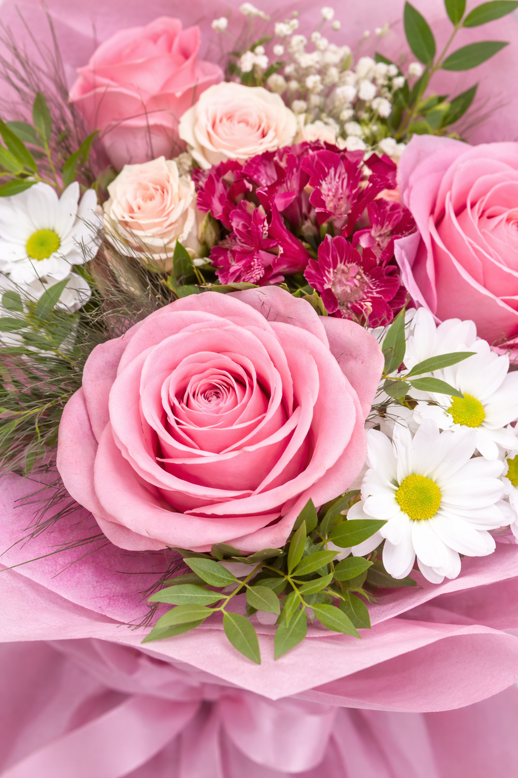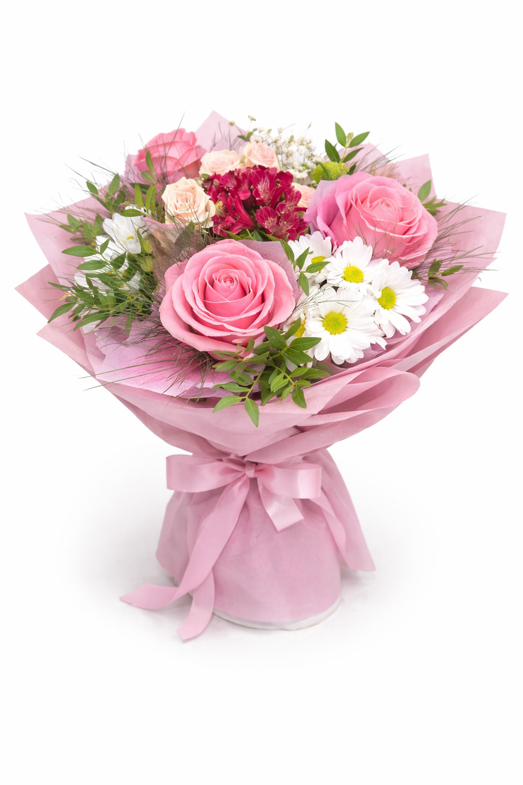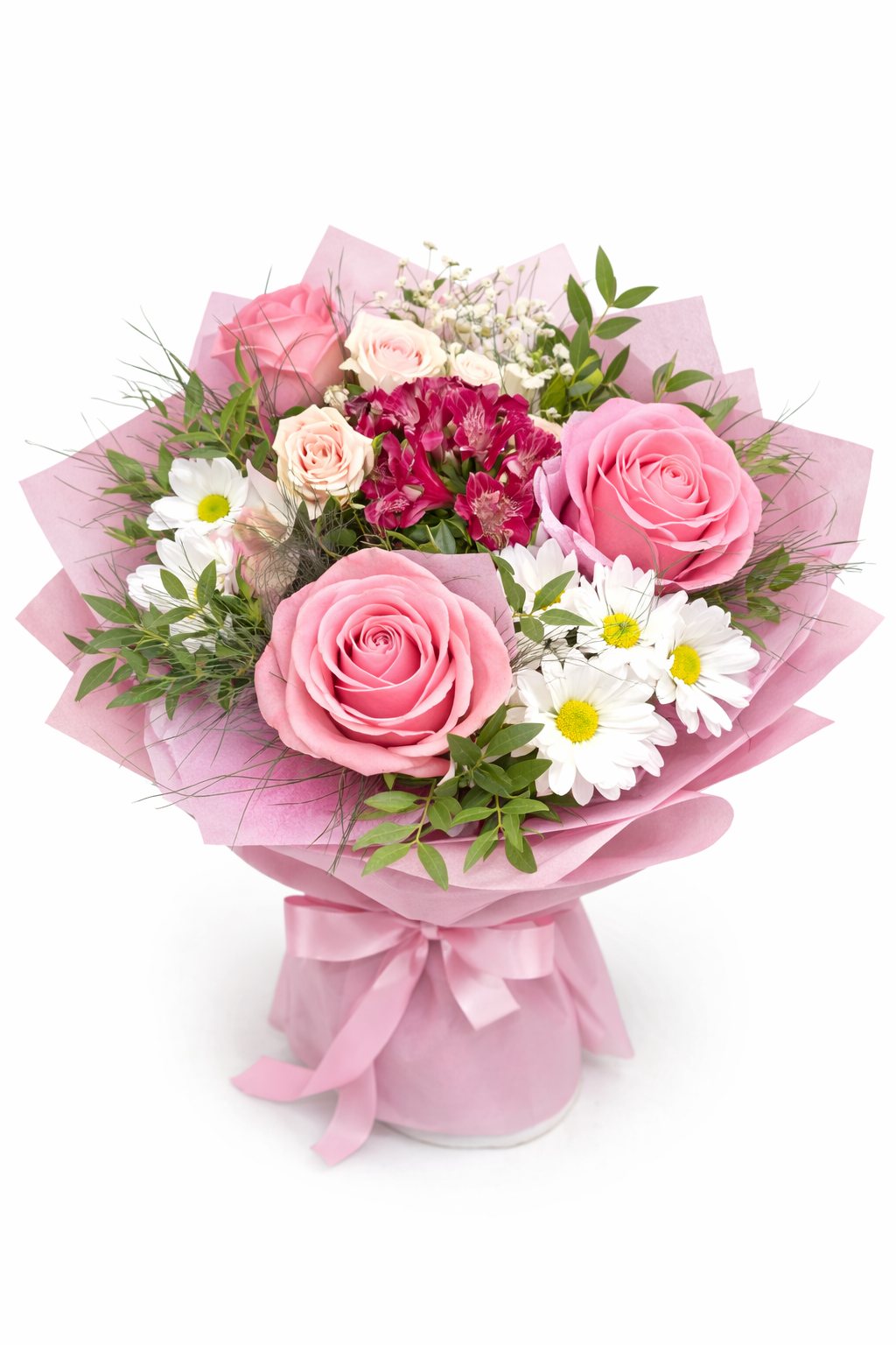 Нежен и изискан букет, съчетаващ класическа розова роза с деликатни кремави спрей рози, свежи бели маргаритки и фини бордо акценти. Богатата зеленина придава естествен баланс и завършва композицията с усещане за лекота и хармония.