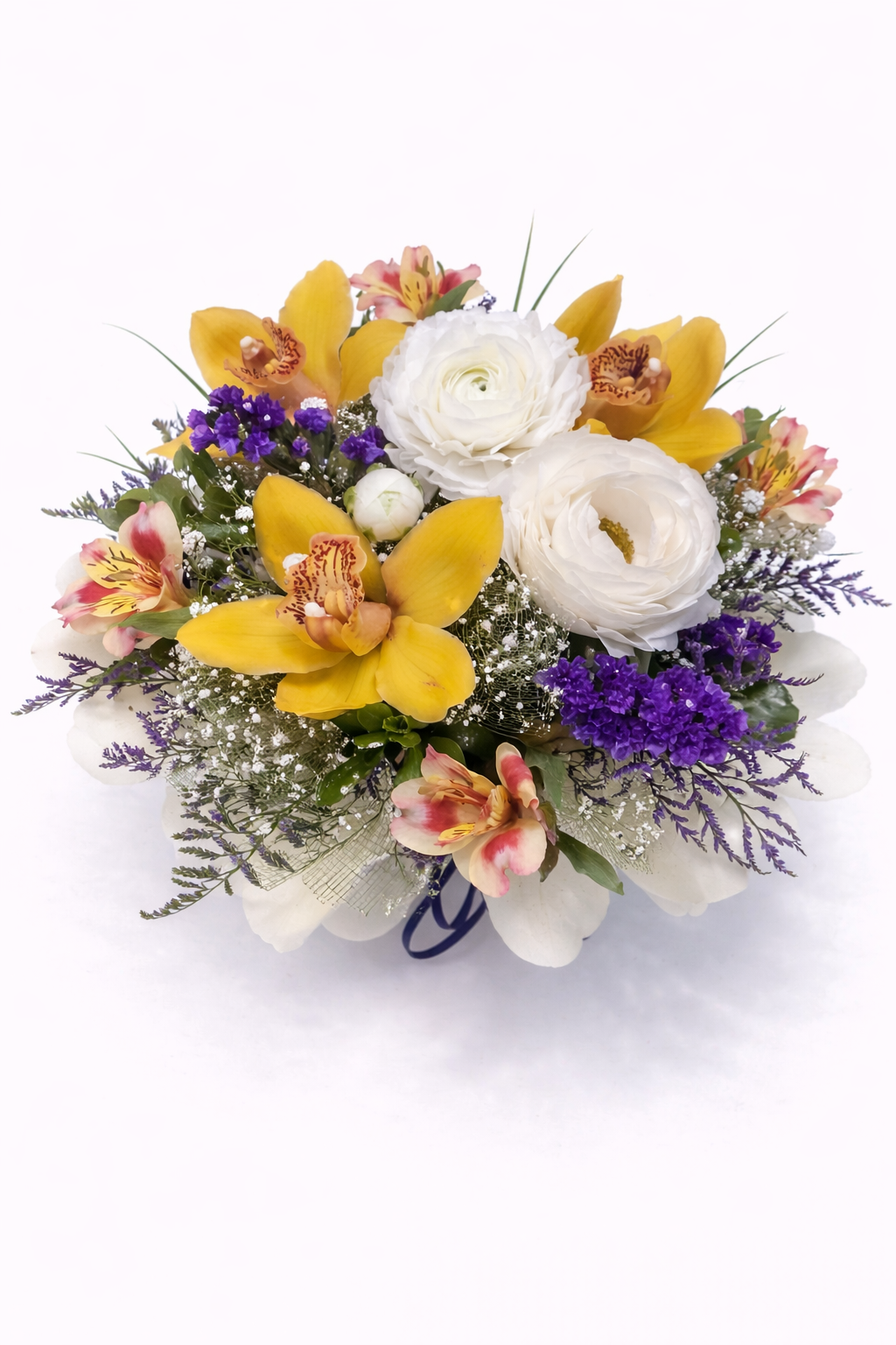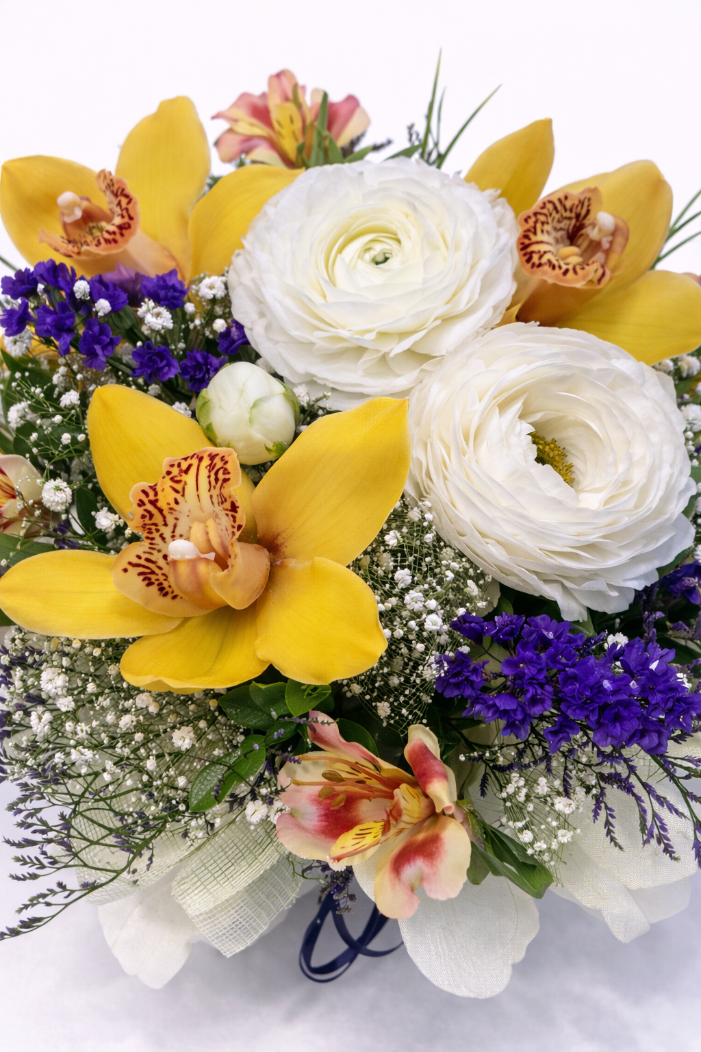Елегантна флорална композиция с орхидеи и ранункулуси, съчетаваща свежи цветове и изискана визия. Перфектен избор за специален повод, който носи усещане за лукс, нежност и стил. Подходяща за подарък, който впечатлява от пръв поглед.