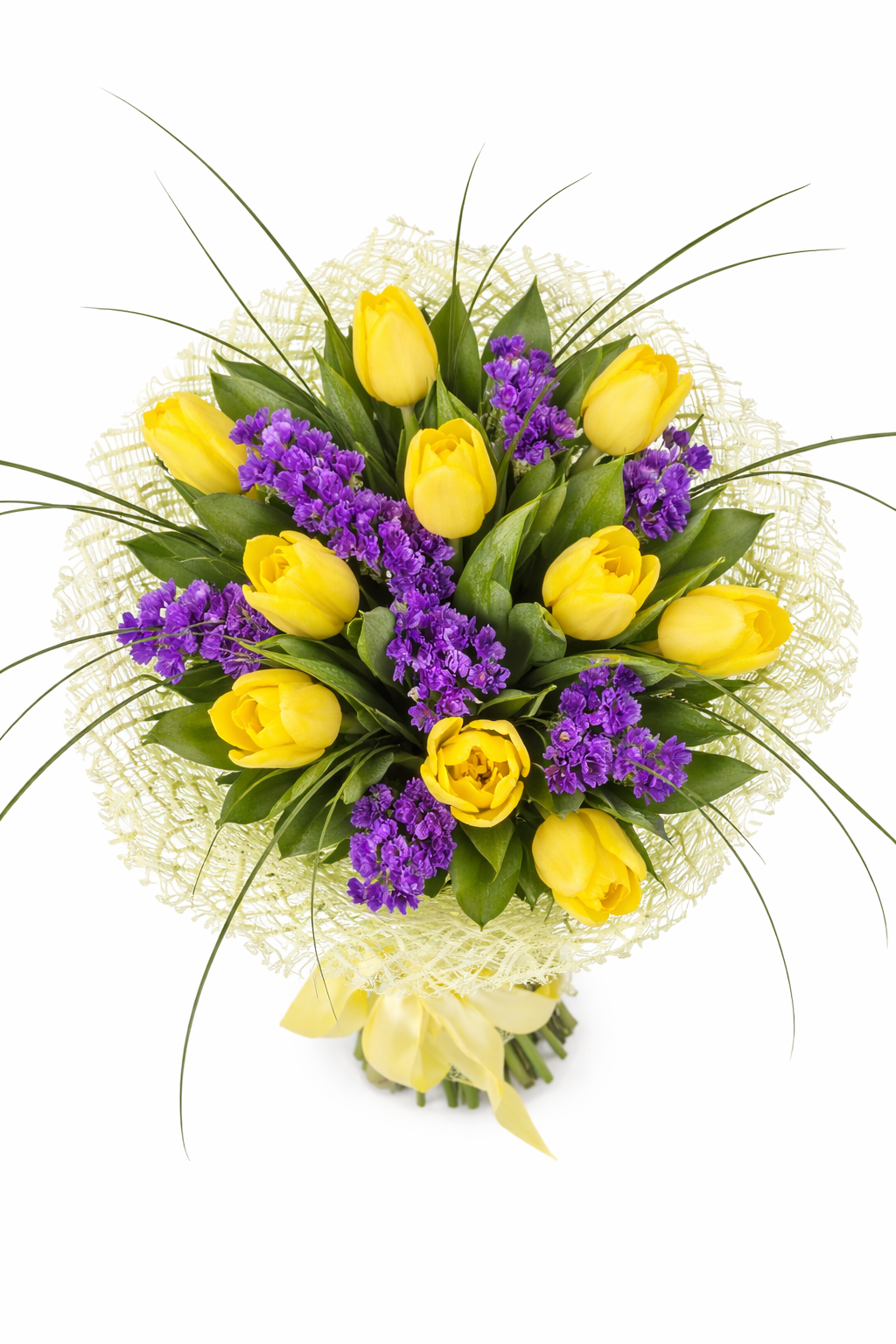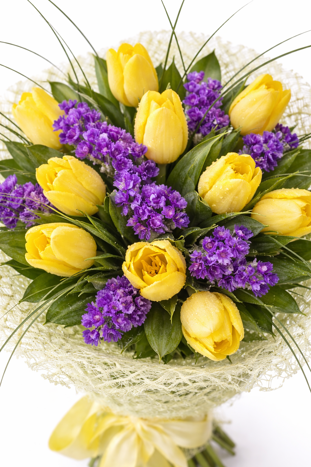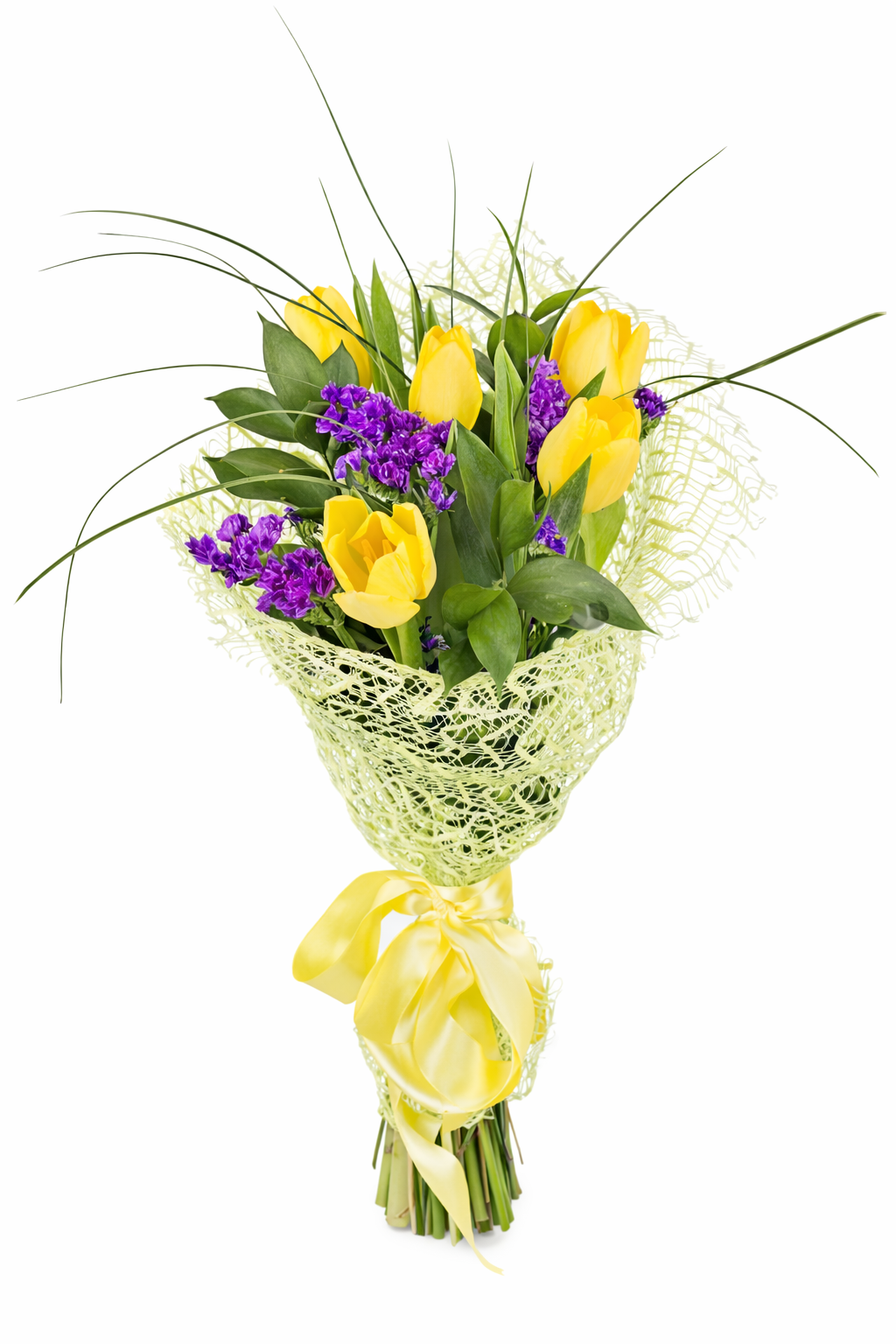 Елегантен и свеж букет с жълти лалета и нежни лилави акценти, съчетани с богата зеленина. Слънчево излъчване и фин стил – перфектен избор за усмивка, ново начало или специален жест към любим човек.