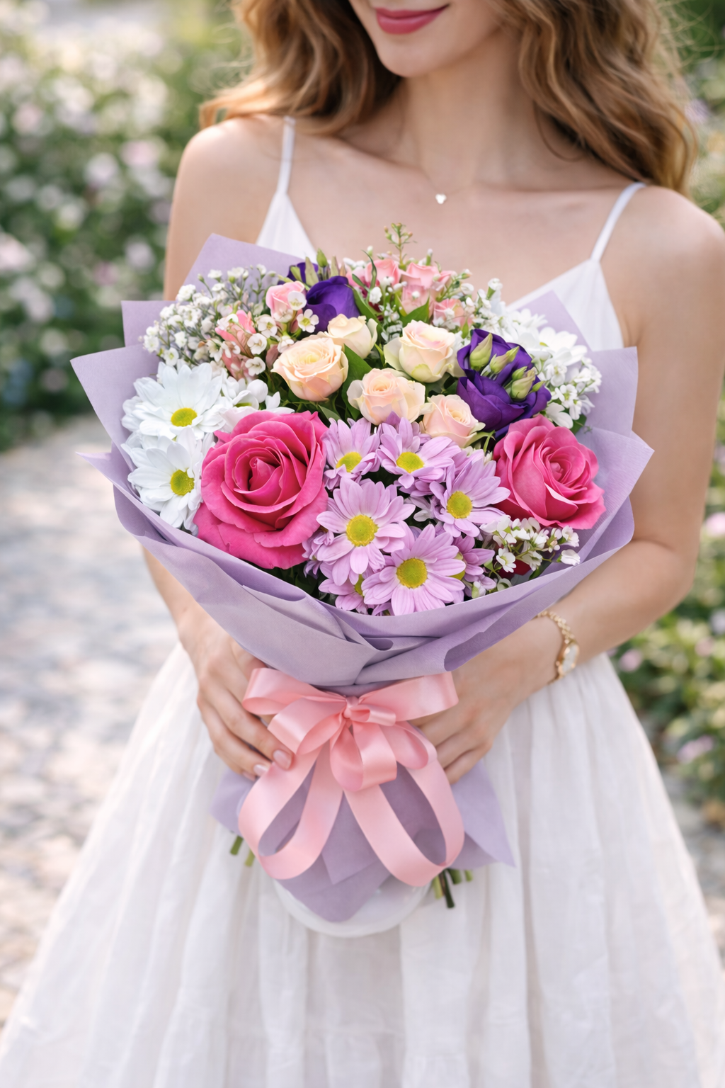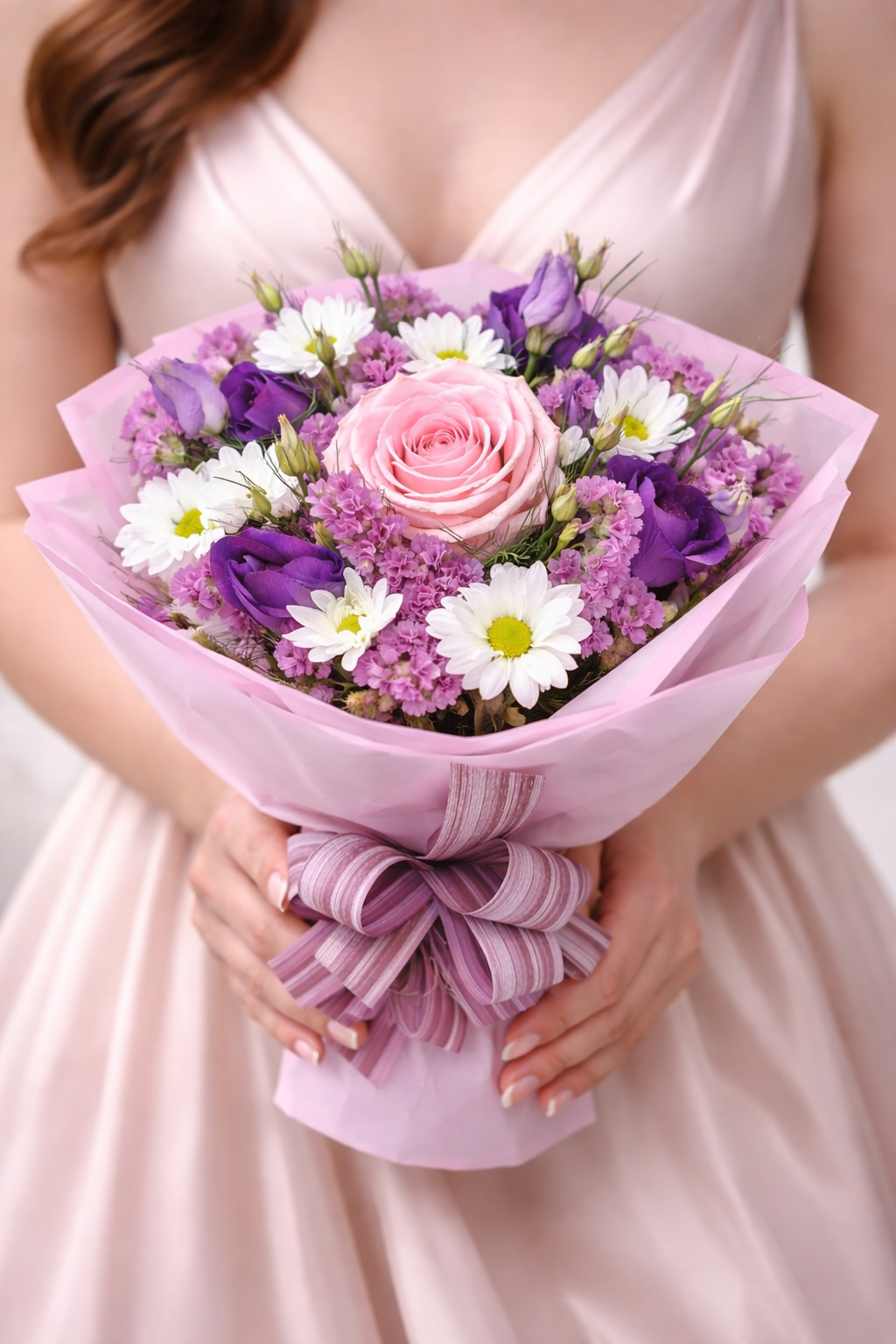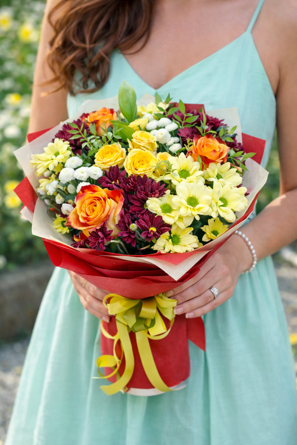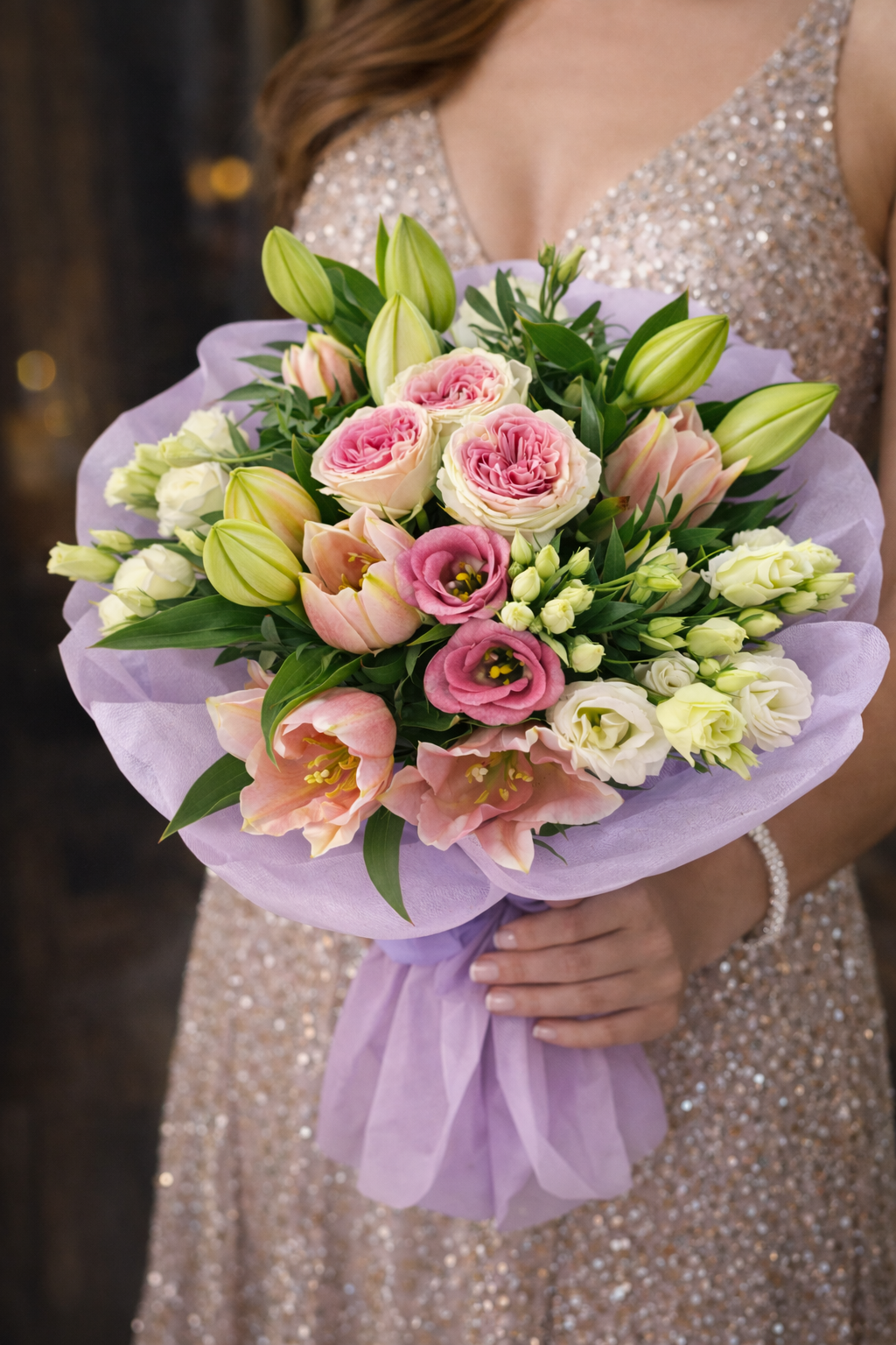 Елегантен и свеж букет с жълти лалета и нежни лилави акценти, съчетани с богата зеленина. Слънчево излъчване и фин стил – перфектен избор за усмивка, ново начало или специален жест към любим човек.