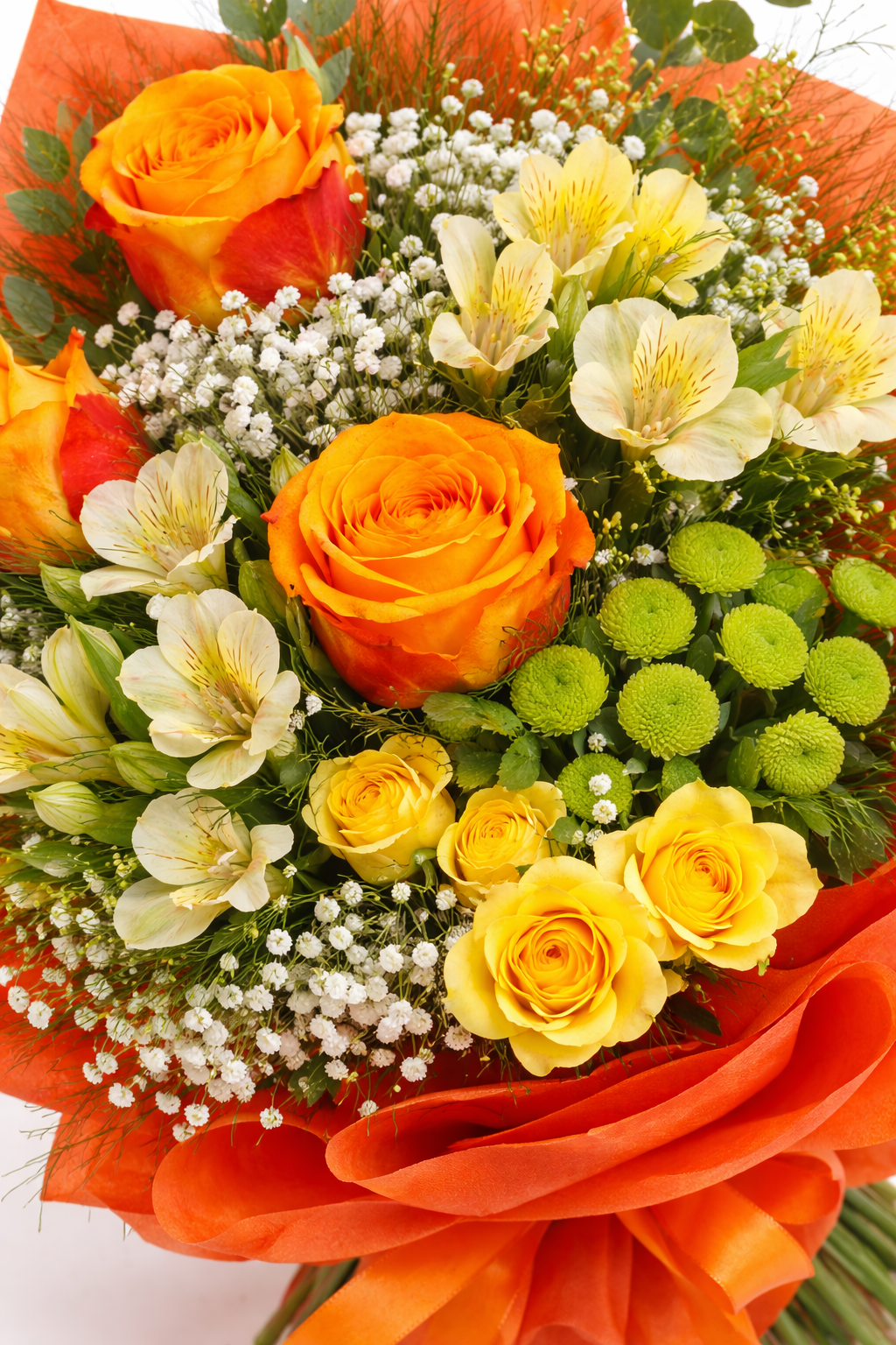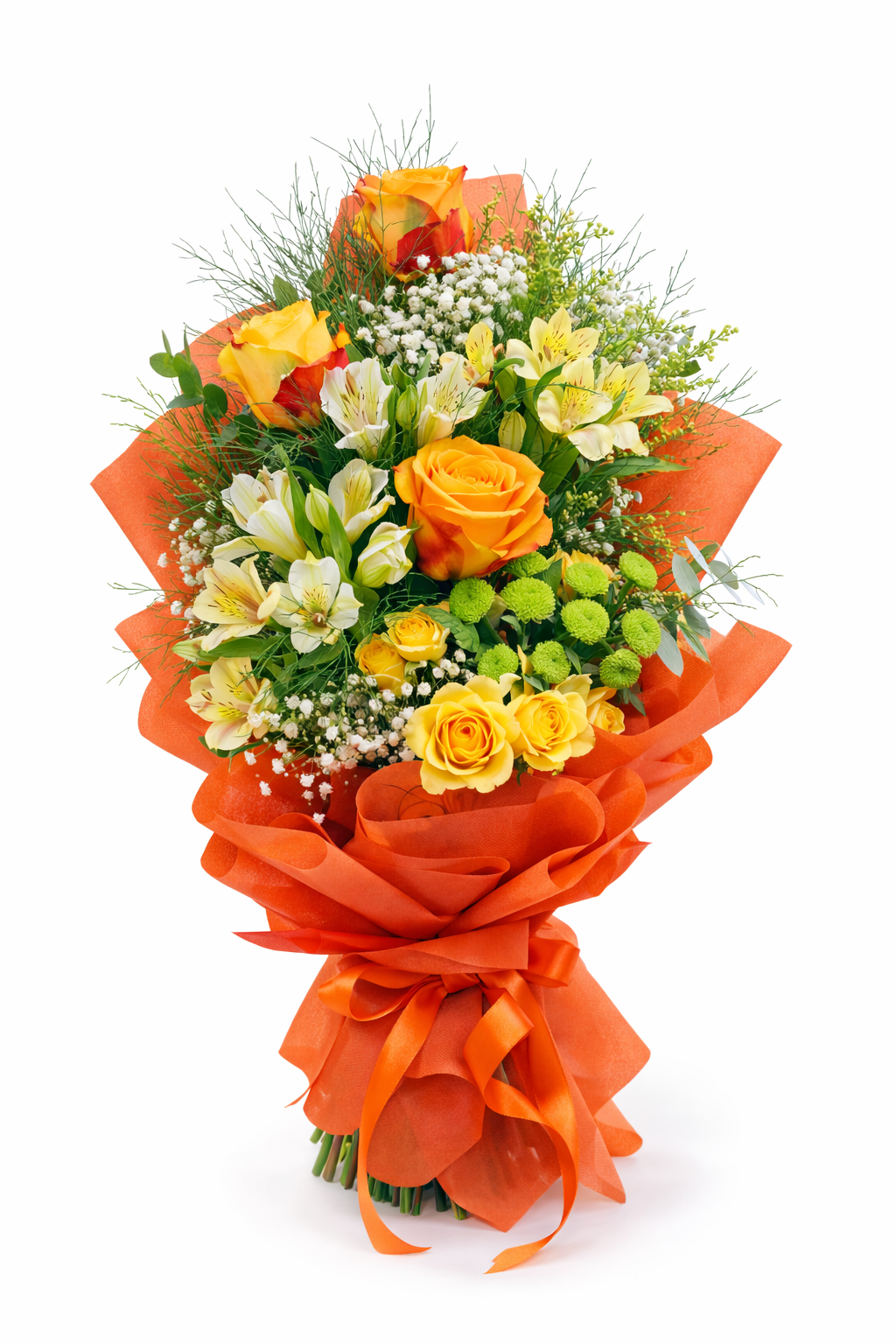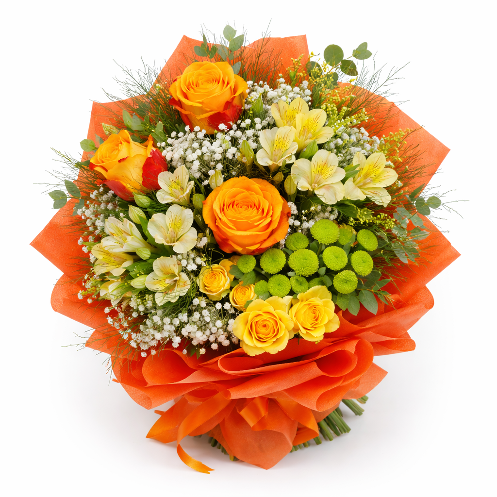 Съчетава наситени оранжеви и жълти рози, нежна алстромерия, деликатна гипсофила и свежи зелени акценти, обгърнати в ярка оранжева опаковка със сатенена панделка. Топлите нюанси носят усещане за слънце, радост и позитивна емоция.